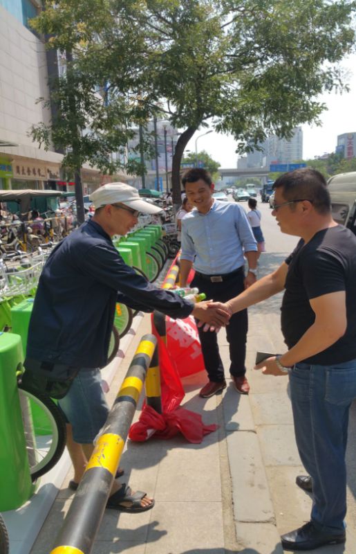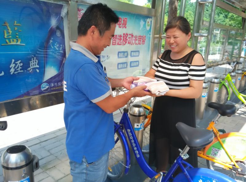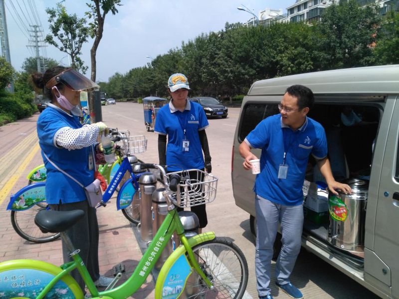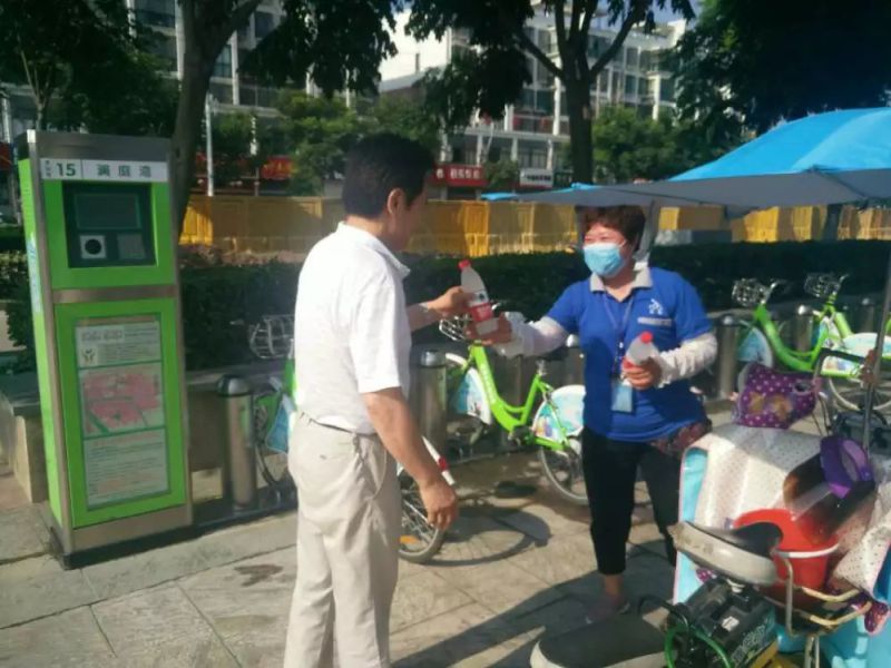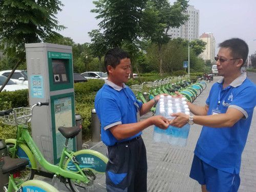 在7月27日下午最熱的時間段,漣水公共自行車管理中心負責人前往站點,為那些堅守在一線的巡檢師傅們送上一片清涼。