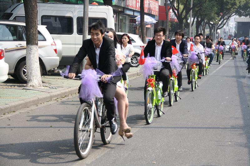 上午10點(diǎn)30分,劉川終于將美麗新娘抱到了自行車上,一溜低碳環(huán)保的自行車迎親隊(duì)開始啟程,從南大街到清潭,再到勤業(yè),十來公路路程,一路上收到眾多市民的眼光。