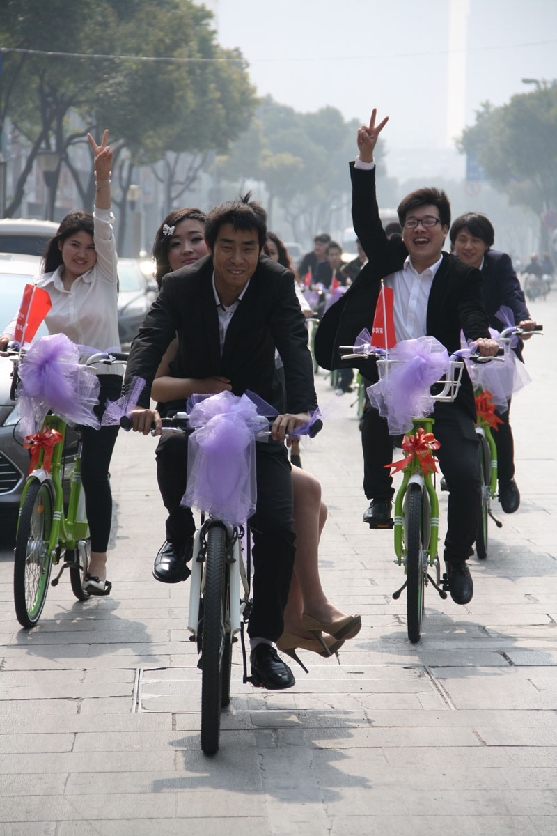 今天上午,專做婚慶活動的山東小伙為自己辦了一場低碳而又浪漫的自行車婚禮,20輛草綠色的公共自行車組成了“豪華”車隊(duì),迎娶他那美麗的新娘。