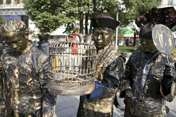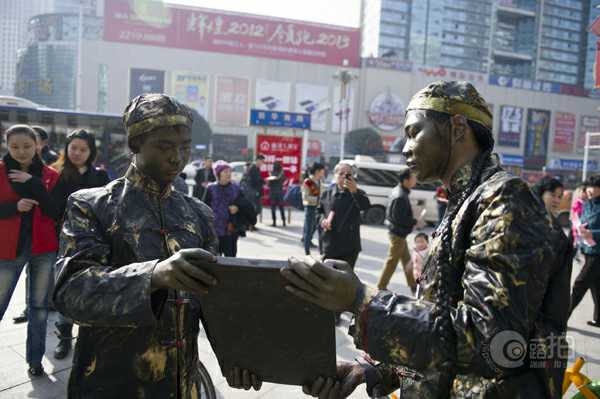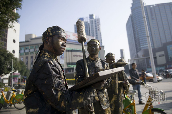 株洲市民在路過(guò)株洲市中心廣場(chǎng)電信大樓前坪時(shí)看到這些雕塑,以為時(shí)下流行的穿越劇情降臨株洲,摸一摸,才敢確信這些雕塑是真人版。