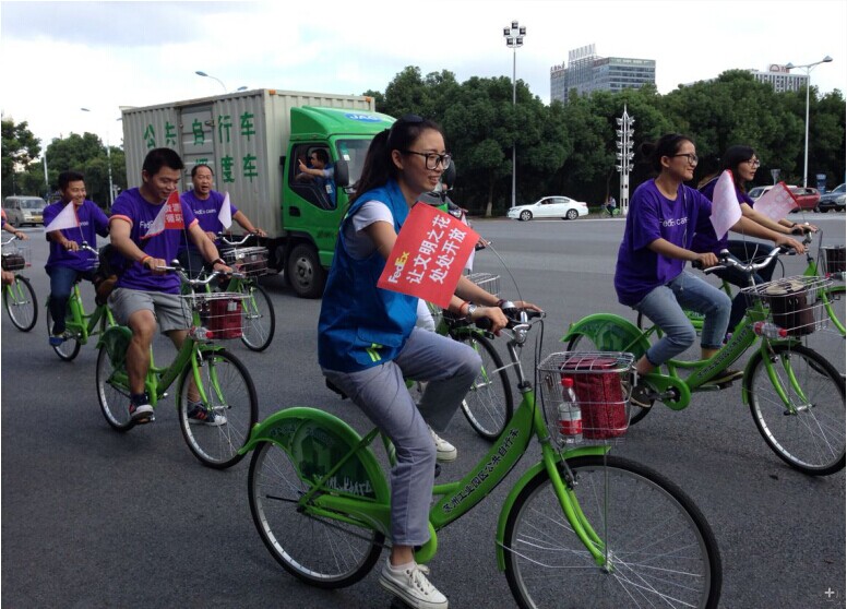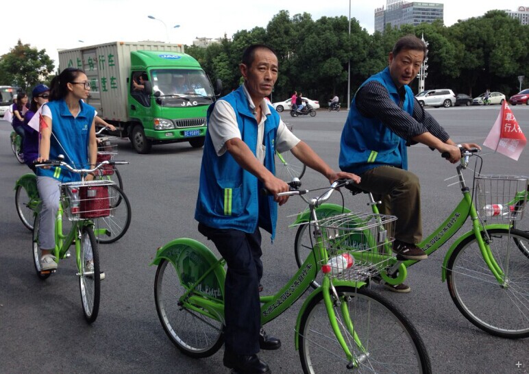 這次活動準(zhǔn)備了30輛綠色自行車,掛上環(huán)保旗幟。沿著園區(qū)的主干道進(jìn)行了1~2小時的騎行。騎行隊伍分為兩支,一支主要圍繞湖西商業(yè)中心進(jìn)行騎行,一支圍繞湖東圓融廣場騎行。沿路向環(huán)衛(wèi)工人等戶外工作人員發(fā)放愛心禮品。
