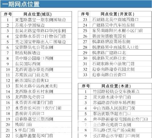 序號 網(wǎng)點位置(城區(qū))1夏蓮路嘉寶一期東側(cè)圍墻邊2蘇苑小學圍墻邊3東吳北路寶帶路口華潤東側(cè)4寶帶路水香街口什物谷門前5美之國寶帶路出入口圍墻邊6寶帶路供電公司東側(cè)7財政局圍墻邊8吳中路公園路口西側(cè)9東吳國際西側(cè)10龍西街道辦事處西側(cè)11蘇苑飯店門前北側(cè)12新蘇國際縣前街口13東吳北路中遠商廈北側(cè)14龍西路水香五村東側(cè)15龍西路先奇街口16水香街蘇州銀行門前17水香街長興街口農(nóng)行門前18縣前街月浜街口19迎春路嘉寶三期西側(cè)20殘聯(lián)門前21 s半島門前22長蠡路蠡墅花園門前