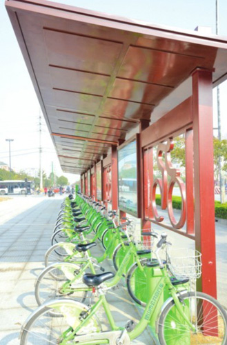 昆山公共自行車二期項(xiàng)目新增設(shè)的150個(gè)站點(diǎn)(含擴(kuò)容)3000輛自行車12月25日投入使用。為方便市民,主管部門在二期項(xiàng)目中為公共自行車站點(diǎn)增設(shè)了雨棚。圖為新建的公共自行車二期雨棚。