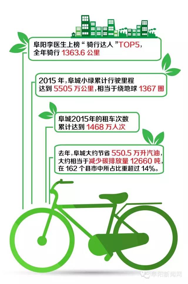 2015年,162個縣市累計騎行18.3億公里,相當(dāng)于繞地球45750圈。 2015年,阜城小綠累計行駛里程達到5505萬公里,相當(dāng)于繞地球1367圈。