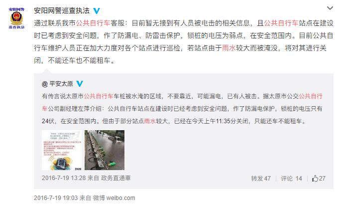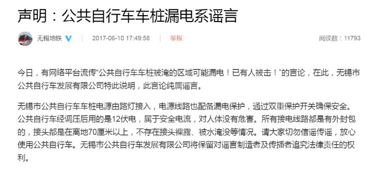 近日,全國多地迎來雨水高發(fā),多年前關(guān)于公共自行車漏電的謠言又開始散播,該謠言已被多種官方可信渠道辟謠,請廣大市民不信謠、不傳謠。永安行所承建的全國250+個公共自行車城市,運(yùn)營至今,從未出現(xiàn)一例漏電或因漏電而導(dǎo)致人員受傷情況。永安行所有公共自行車系統(tǒng)設(shè)備,均通過了極寒、高溫、高濕、高鹽等超常環(huán)境的考驗,系統(tǒng)站點(diǎn)在建設(shè)時已經(jīng)考慮到安全問題,都安裝有漏電保護(hù)裝置,一旦發(fā)生漏電現(xiàn)象,系統(tǒng)設(shè)備將自動斷電;公共自行車系統(tǒng)設(shè)備的輸出電壓不高于15V,屬于安全電壓范圍;系統(tǒng)軟件對每個站點(diǎn)的電壓和溫度進(jìn)行實時監(jiān)控;運(yùn)營單位在運(yùn)營管理中每周對系統(tǒng)設(shè)備進(jìn)行安全檢查,排除漏電隱患;一旦出現(xiàn)特殊惡劣的天氣,例如:大雨、暴雪,永安行公共自行車運(yùn)營公司會及時關(guān)閉系統(tǒng)。 此外,運(yùn)營公司工作人員會始終堅守一線,排查存在安全隱患的站點(diǎn)進(jìn)行斷電處理!保障市民用車!