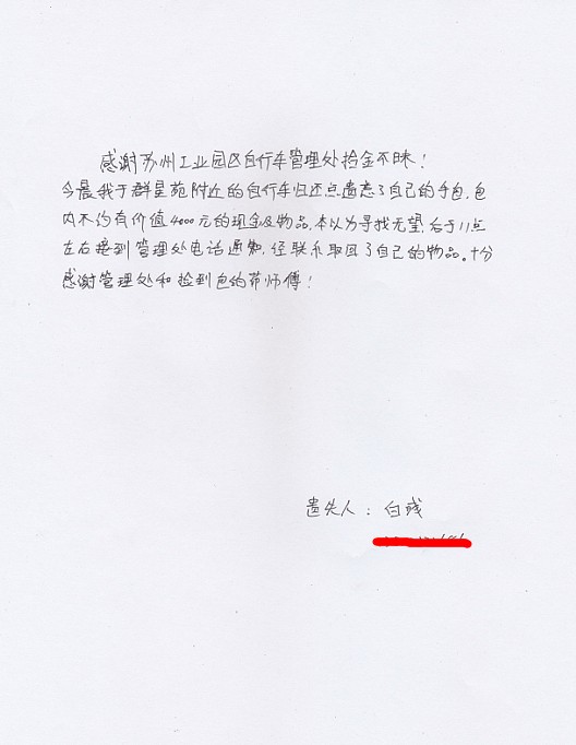 失主認(rèn)領(lǐng)后非常感動(dòng)隨及拿出一部分作為酬謝,被茆師傅和李師傅婉言拒絕!失主非常感動(dòng),他說(shuō):“我是從北京到蘇州旅游的。今天在園區(qū)金雞湖附近游玩不慎將包遺忘了。本以為找不到了,沒想到不超過(guò)2小時(shí)你們就聯(lián)系到我了,非常感謝你們。蘇州園林真美、蘇州市民的素質(zhì)真高!”