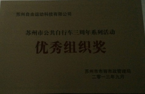 為倡導(dǎo)“低碳生活,綠色出行”理念,進一步鞏固和提升我市公共自行車服務(wù)與管理水平,按照我市開展無車日活動工作的統(tǒng)一部署,結(jié)合《“綠色蘇州夢 我們在行動” 蘇州公共自行車啟用三周年系列活動方案》,蘇州市市容市政管理局于2013年4月---9月開展了蘇州市公共自行車啟用三周年系列活動。在各級部門的廣泛發(fā)動和認真組織下,活動取得了圓滿成功。本次活動得到了社會各方的關(guān)心和支持,也得到了市民群眾的熱烈響應(yīng)和參與積極,有效傳播了“綠色出行”理念和公共自行車文化,取得了良好的社會效果。在此次活動中我公司被授予“優(yōu)秀組織獎”的榮譽稱號。