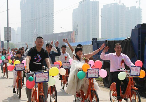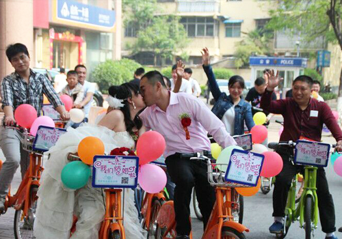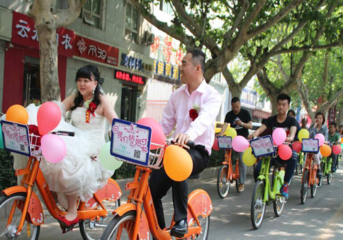 城區(qū)內(nèi)現(xiàn)最“亮”婚車隊(duì)——浪漫與環(huán)保并舉 婚禮當(dāng)日,城區(qū)街頭出現(xiàn)了一片“壯觀”的景象——30人騎著掛滿氣球的公共自行車,組成一排“豪氣”的婚禮車隊(duì)。在隊(duì)伍最前端“領(lǐng)騎”的是一對新人,新娘身著一襲潔白婚紗、人群中顯得清新亮麗,新郎身著筆挺的西裝,打著領(lǐng)帶,胸前佩戴著鮮艷的胸花,英俊帥氣?! ∵@支公共自行車迎親隊(duì)從古槐路黨校大廈出發(fā),最后到達(dá)西郊宋南村。所到之處無不吸引市民的駐足觀看,大家一邊報(bào)以贊許的目光和微笑祝福新人,一邊紛紛拿出手機(jī)記錄這與眾不同的時(shí)刻?!?“用自行車當(dāng)婚車,真浪漫??!這比寶馬、奔馳接新娘子拉風(fēng)多了!”,在古槐路等公交車的宋先生說這是他第一次看到新郎用自行車接媳婦,和租用豪華轎車“接親”相比,用自行車既浪漫又環(huán)保。