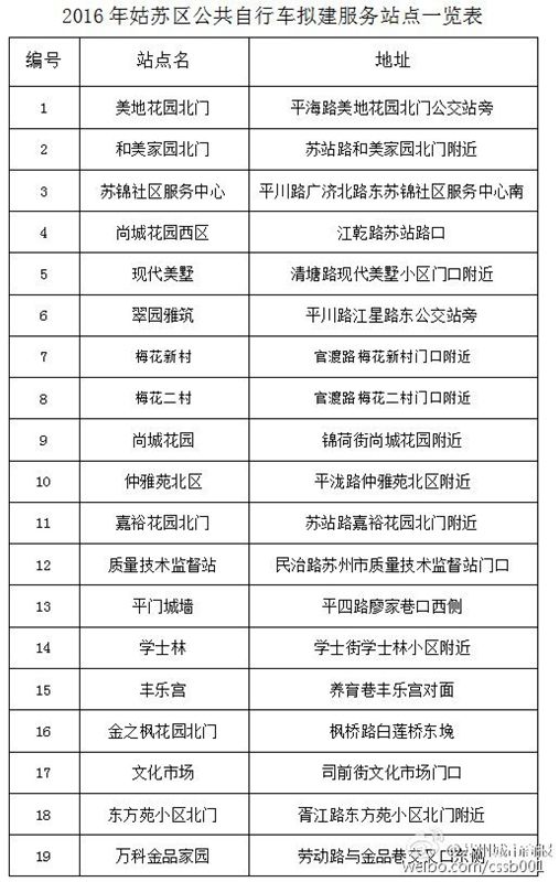 姑蘇區(qū)公共自行車服務網(wǎng)點擬定2016年新建70個,計劃投放公共自行車2000輛。現(xiàn)將前期60個站點予以公示。公示時間4月18日-4月25日,如有意見或建議可通過電話、郵件及12345便民熱線等方式向市市容市政管理局反映。電子郵件:szbicycle@126.com;市數(shù)字城管:0512-69331110;其他方式:12345便民熱線 寒山聞鐘論壇。